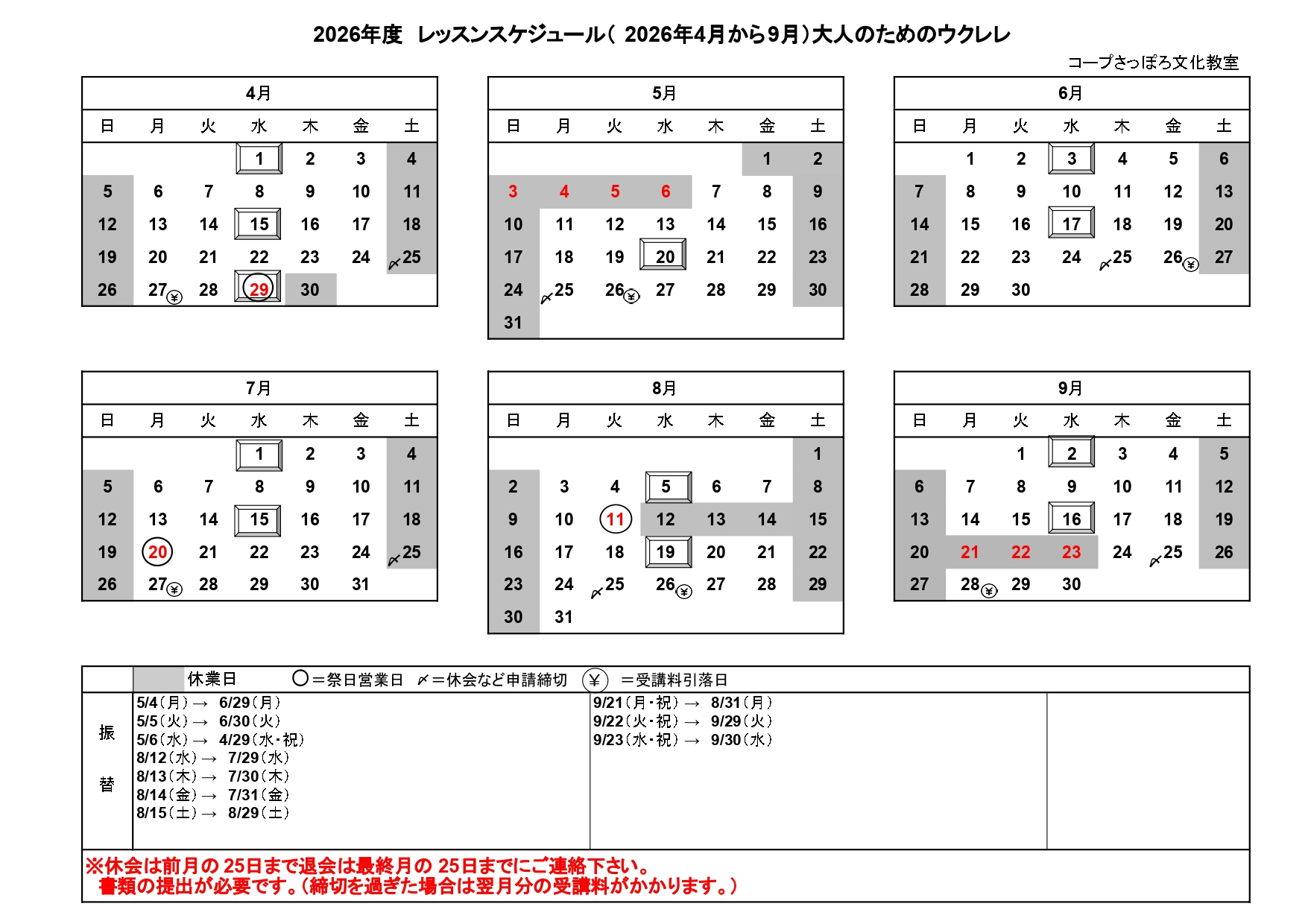 | 教材コメント | 入会した場合は各自ウクレレ購入(持っている方は対象外です) 体験は随時受け付けております。 |