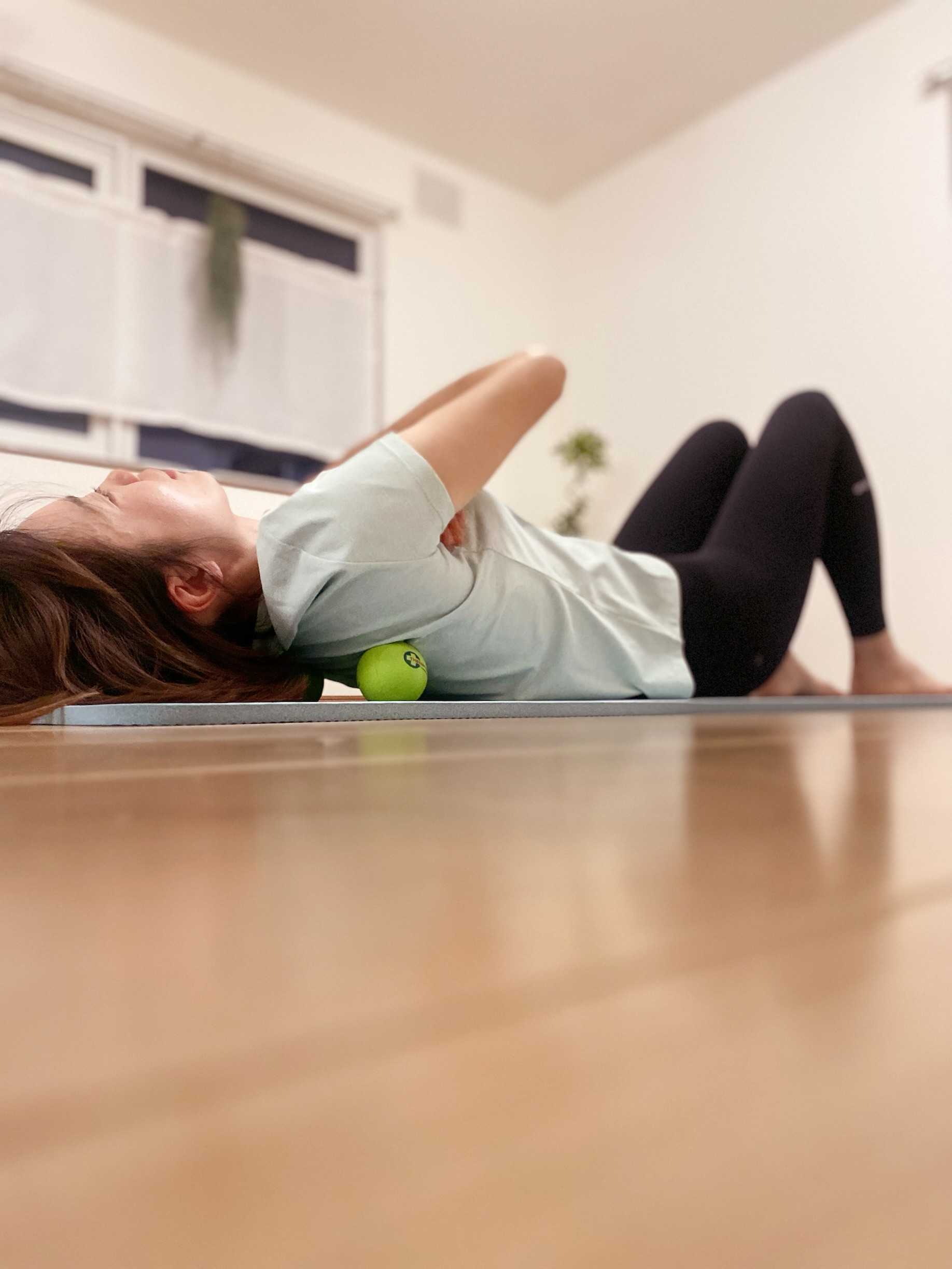 ボールで筋膜をほぐしてピラティスをはじめます。