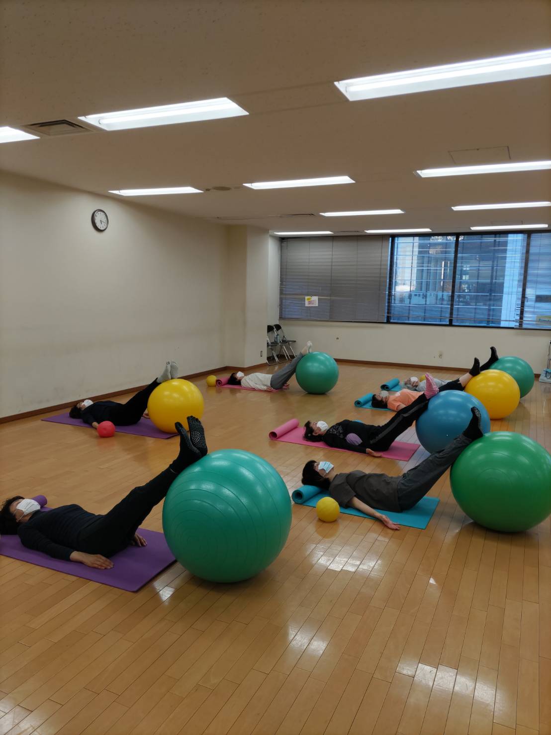 不安定なボールを扱いながら色々な筋肉を使って運動します。楽しくマイペースで体幹を鍛え 目指すは健康的な美姿…