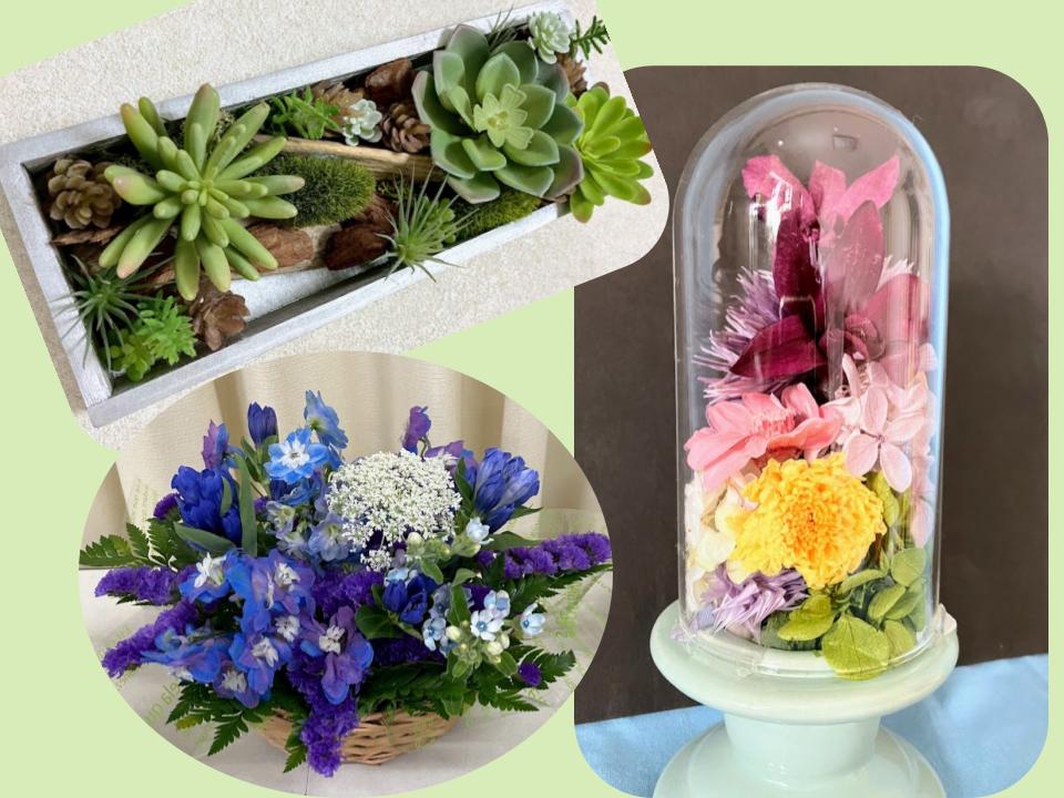 素材の違うお花で、いろいろ体験。まずはやってみたい方にお薦めです。 ・5/13アートグリーンの壁掛け …